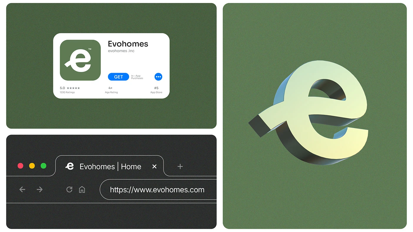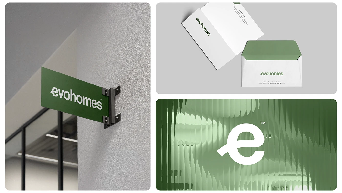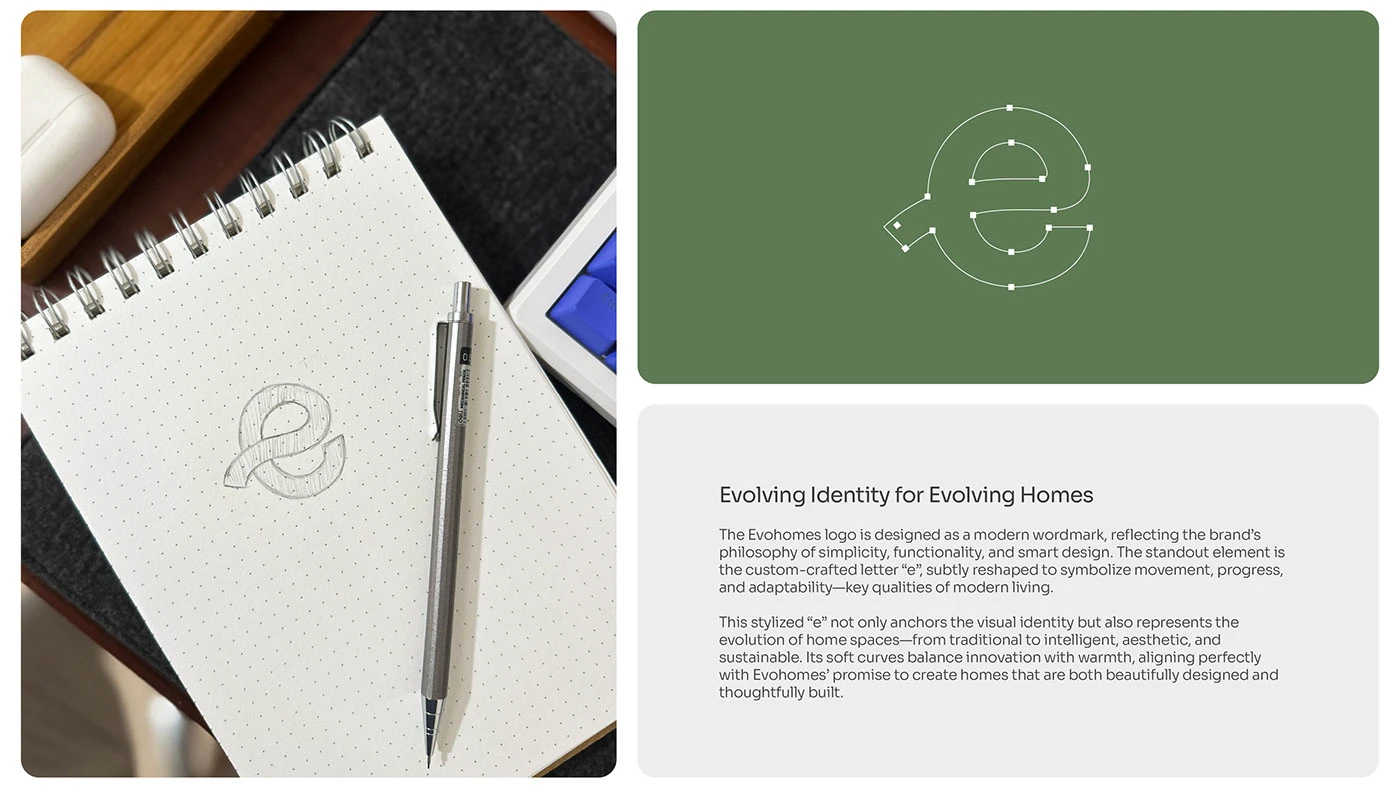 These tones not only enhance visual appeal but also symbolize the brand’s values—sustainability, stability, and understated luxury. The blend of earthy hues with clean whites and rich blacks creates a versatile system, perfect for both print and digital experiences across Evohomes’ branding, products, and interior touchpoints.