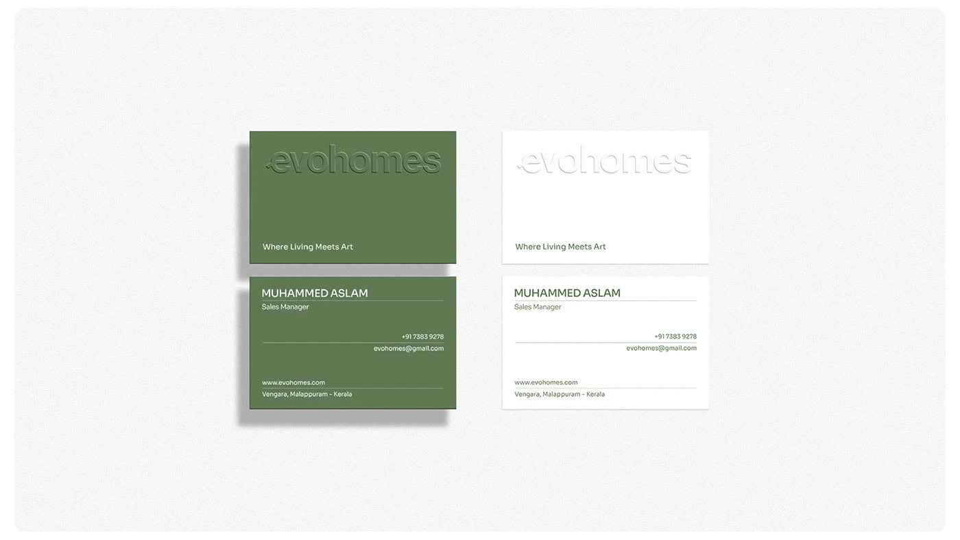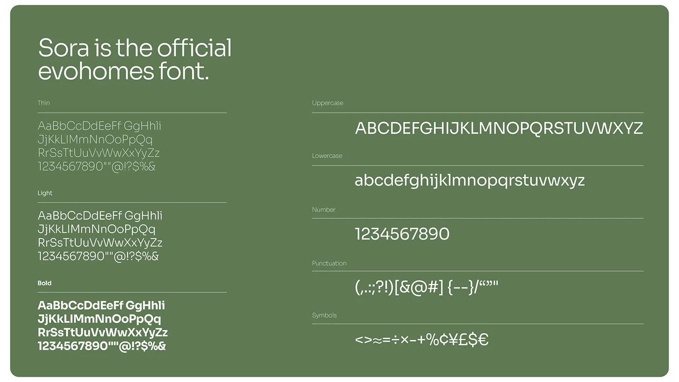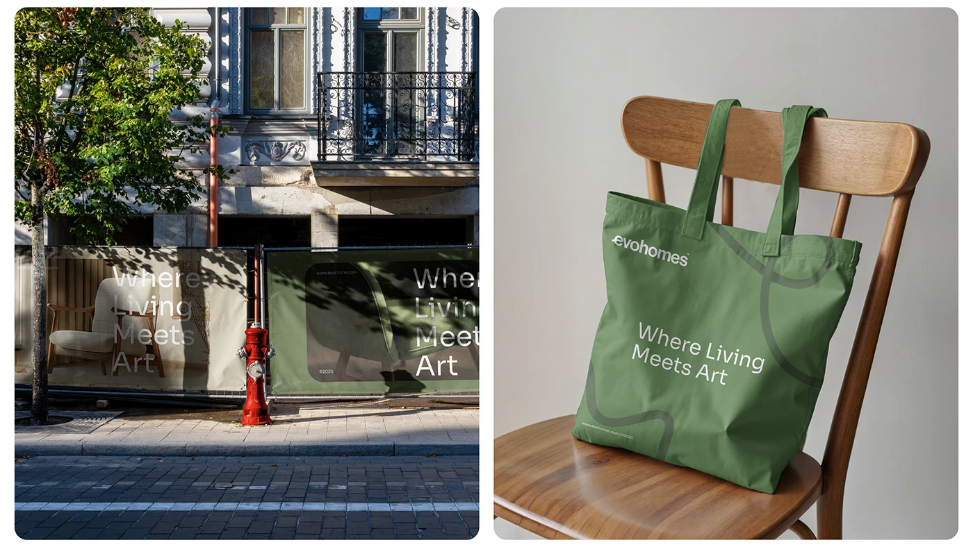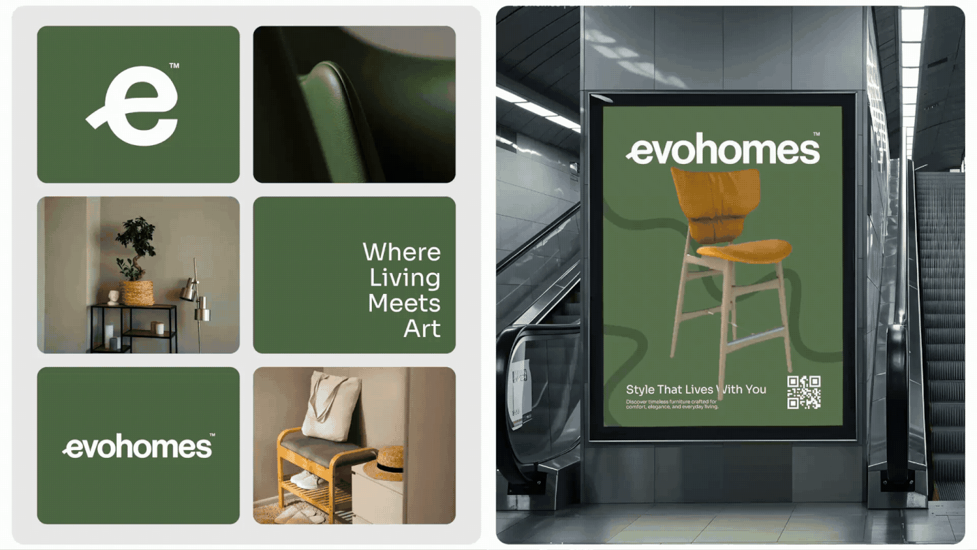These tones not only enhance visual appeal but also symbolize the brand’s values—sustainability, stability, and understated luxury. The blend of earthy hues with clean whites and rich blacks creates a versatile system, perfect for both print and digital experiences across Evohomes’ branding, products, and interior touchpoints.