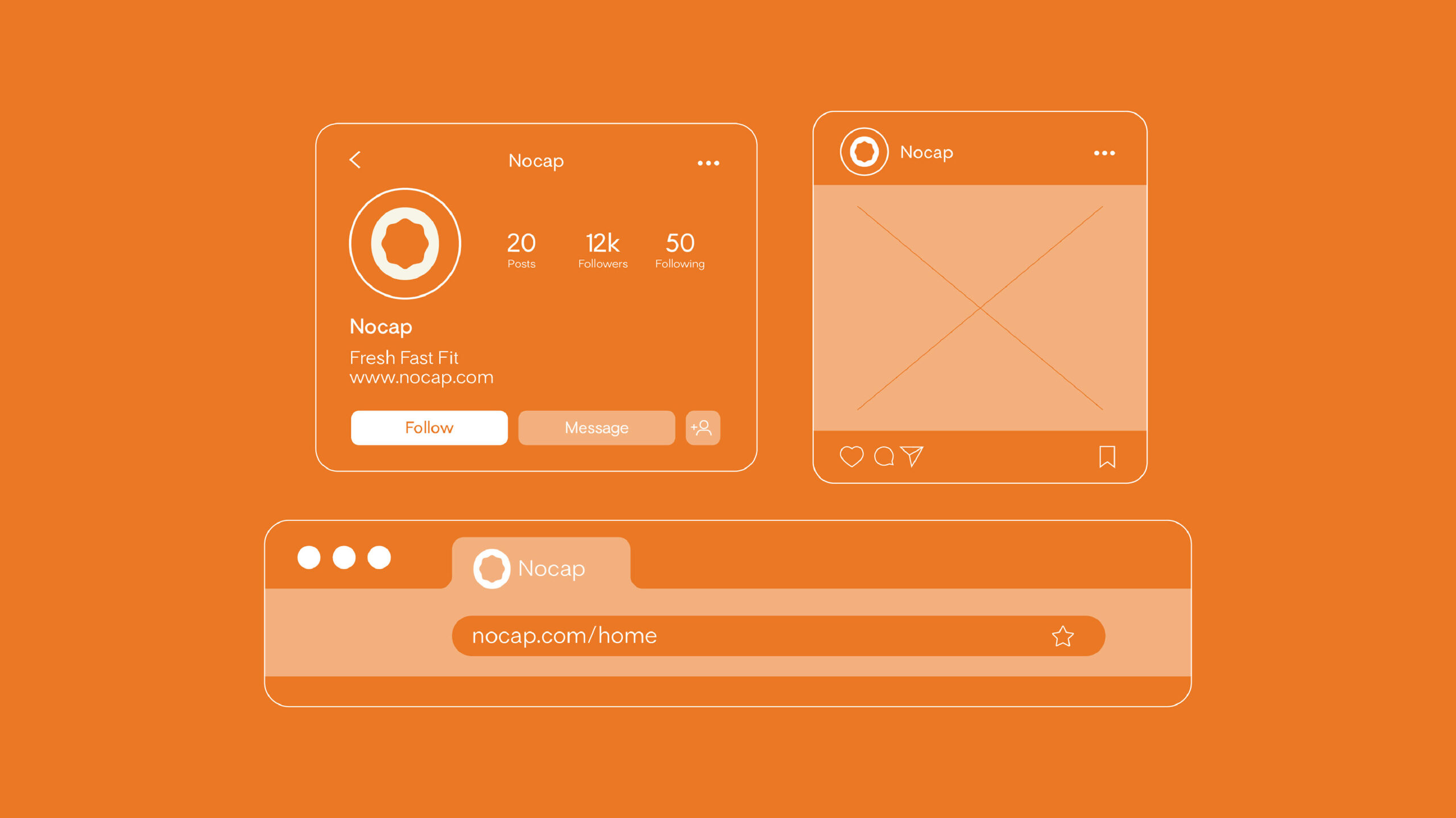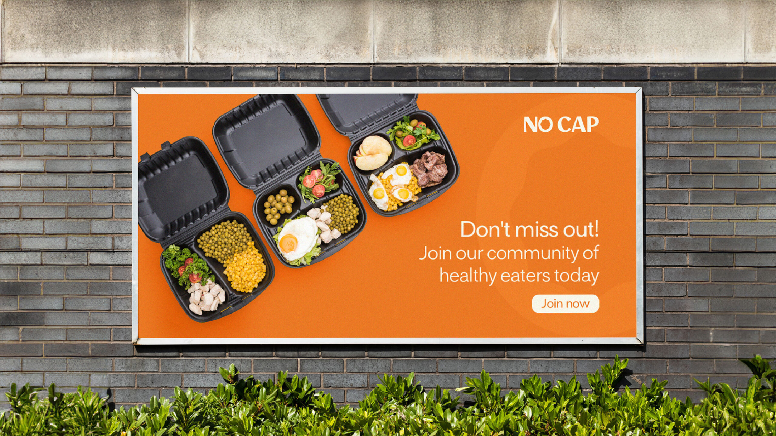 The ‘No cap’ brand identity includes key elements that connect to its purpose. The logo has two closed shapes. The outer shape represents a round table with people seated. The inner ‘O’ looks like broccoli’s curved edges, symbolizing bite-sized food.